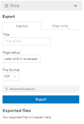 If printing with the Layout tab, then the following inputs are available:- Title: Title to appear over the map and to be used as a file name in the exported files list.